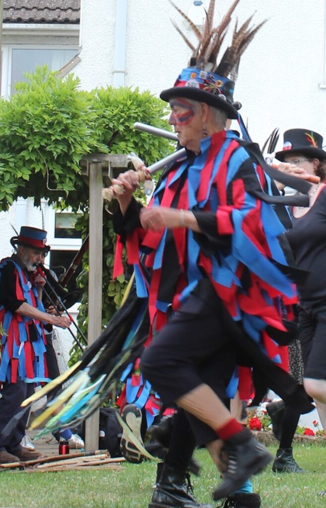 Border Morris is dancing for the adventurous with wild dances, driving rhythms, raucous dancers, enthusiastic stick clashing and dark but colourful outfits – and it’s a great workout. We started in May 2025 with three dancers but by the beginning of September 2025 we had 12, ranging from complete beginners to very experienced, and aged from 11 to 80. We’re very keen to recruit more so if you fancy trying Border dancing just turn up at a practice or contact us.