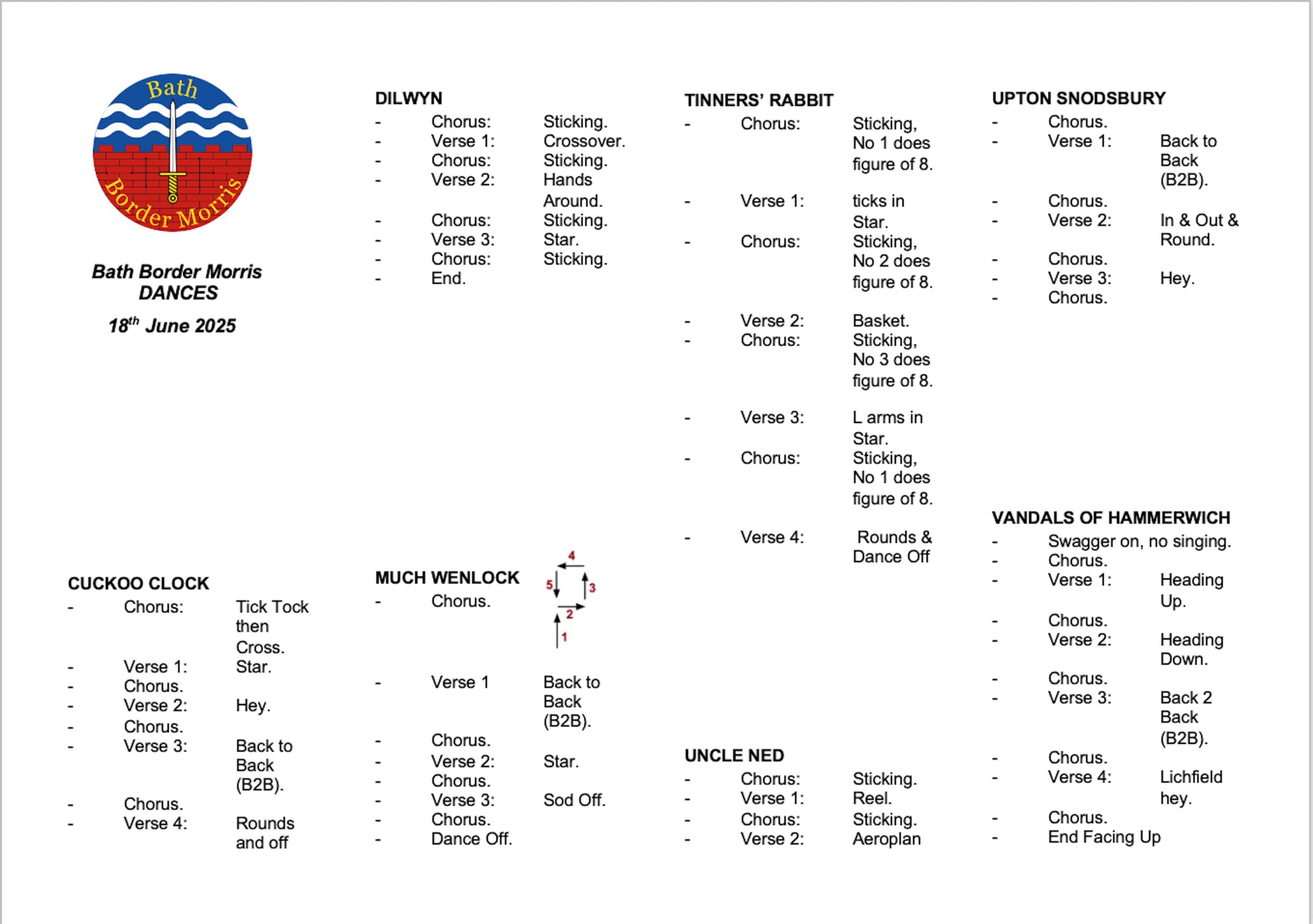 We have a repertoire of seven dances at the moment all listed in our Dance Book here. Dancers can download a summary foldable A4 version from here – print it landscape not portrait.
